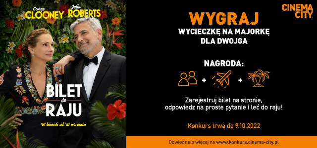 Konkurs trwa do 9 października i jest niezwykle prosty. Wystarczy kupić bilet na film “Bilet do raju” do jednego z naszych kin, wejść na stronę konkursową https://www.konkurs.cinema-city.pl/, zarejestrować swój bilet i odpowiedzieć kreatywnie na pytanie: “Lecisz samolotem na Majorkę i okazuje się, że miejsce obok zajmuje Twój były/była. Jak wybrniesz z niezręcznej sytuacji podczas kilkugodzinnego lotu?”. Najciekawsze zgłoszenie zostanie nagrodzone przez jury konkursowe magiczną wycieczką na rajską wyspę. Zwycięzca wraz z osobą towarzyszącą będzie mógł skorzystać z: przelotu w dwie strony na Majorkę, trzech noclegów w hotelu ze śniadaniem, dwugodzinnego rejsu łódką po Morzu Śródziemnym oraz kolacji w prestiżowej restauracji. Pogoda za oknem coraz gorsza, więc warto dać sobie szansę na ucieczkę w tropiki i wygranie biletu do raju.