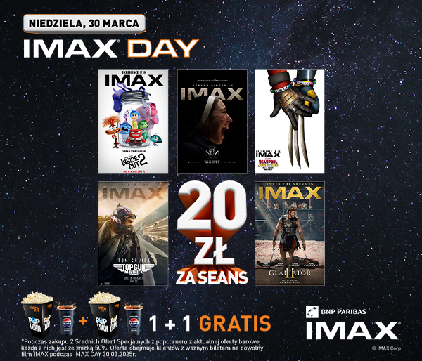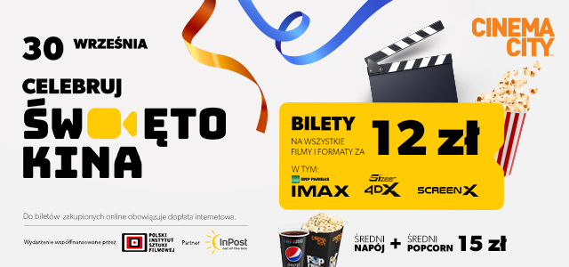 W najbliższą sobotę, 30 września, odbędzie się 8 edycja ogólnopolskiego Święta Kina! To wyjątkowe święto całej branży kinowej, która ponad podziałami tworzy je razem, propagując tym samym kulturę chodzenia do kina. Tego jednego dnia, wszystkie bilety do kin w całej Polsce kosztować będą tylko 12 zł. W naszych kinach w tej super cenie będzie można zakupić także bilety do formatów specjalnych: IMAX, 4DX oraz ScreenX. To najlepsza okazja, aby poznać te innowacyjne technologie kinowe i wejść w akcję filmu jeszcze bardziej. Na tym jednak nie koniec! Dla tych, którzy lubią sobie w kinie pochrupać przygotowaliśmy specjalną oferta na przekąski barowe – tylko tego dnia średni popcorn i średni napój będzie można zakupić w cenie 15 zł.