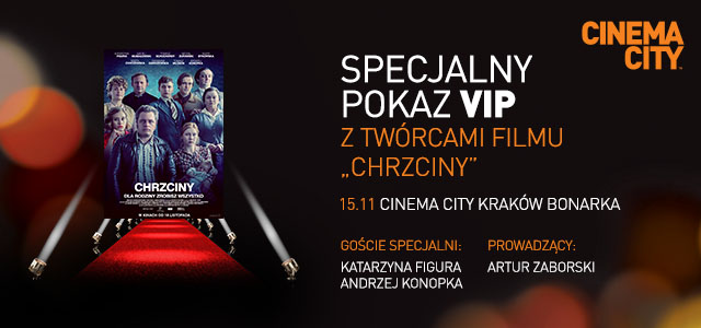 15 listopada o 19:00 do tych benefitów dołączy przedpremierowy pokaz filmu “Chrzciny” z udziałem Katarzyny Figury oraz Andrzeja Konopki oraz uczestnictwo w rozmowie z gwiazdami, którą poprowadzi dziennikarz Artur Zaborski. Jakby tego było mało każdy uczestnik pokazu będzie miał możliwość przejść się po czerwonym dywanie, sfotografować na ściance, a także porozmawiać z gwiazdami. Nie czekaj i kup bilet już dziś: https://www.cinema-city.pl/filmy/chrzciny-pokaz-vip-z-tworcami-filmu/