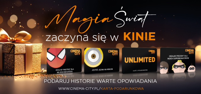 Święta tuż, tuż. To wyjątkowy czas, kiedy w szczególny sposób obdarowujemy innych ciepłem, miłością i prezentami. Wszystkim, którzy wciąż nie mają prezentu dla swoich najbliższych, Cinema City przychodzi z pomocą i zachęca do podarowania im najlepszych kinowych emocji oraz wspólnych chwil pełnych filmowej magii. Co to za prezent zapytacie? Karta podarunkowa na dowolny seans w kinie lub dla prawdziwych kinomanów. Cinema City poleca Kartę Podarunkową Unlimited, czyli abonament na rok seansów bez limitu. A co najlepsze, by ją kupić wystarczy kilka kliknięć. To idealny prezent na ostatnią chwilę i perfekcyjnie skrojony dla każdego!