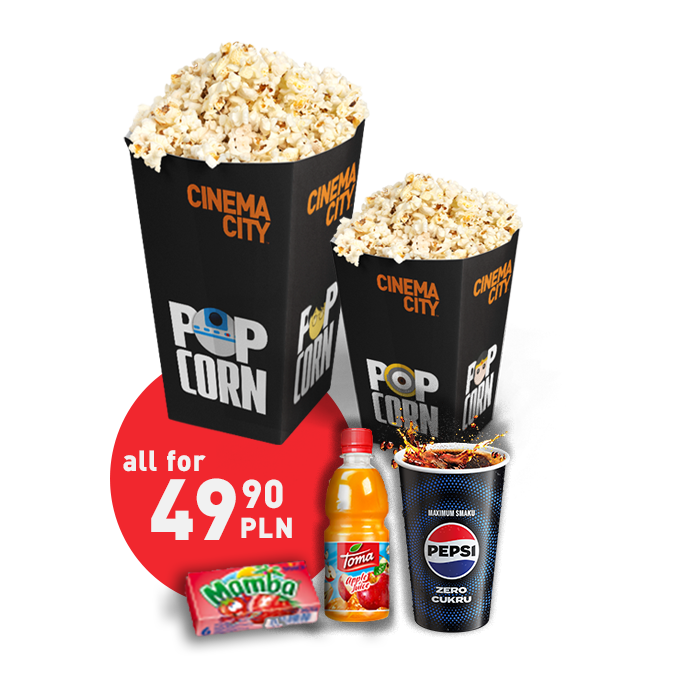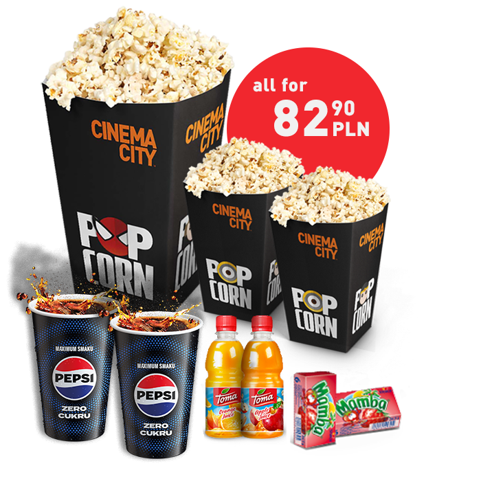- 1.5 l popcorn + 0.33 l TOMA juice + toy for PLN 34.90