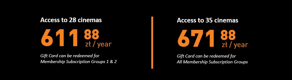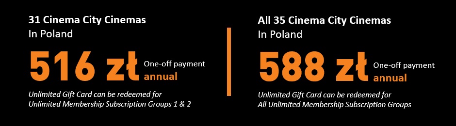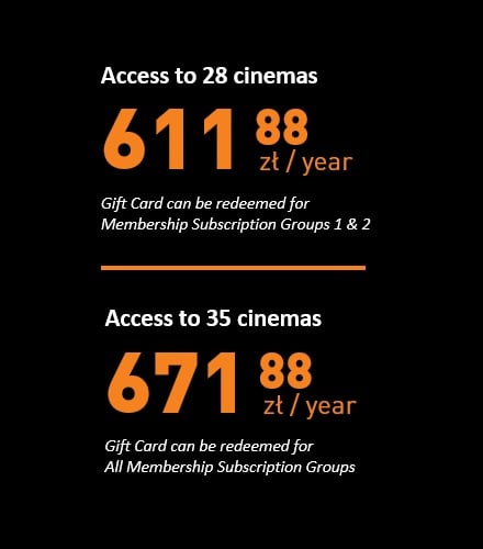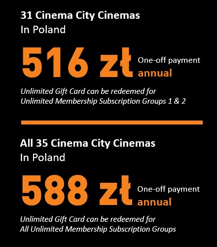 Physical “bearer” gift card. You can buy it at any Cinema City cinema in Poland, paying in cash or by credit card. Valid for 6 months from the date of purchase. Allows you to pay for your annual Unlimited membership on the Cinema City website. The Gift Card is activated within 24 hours from the time of purchase.