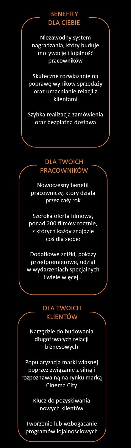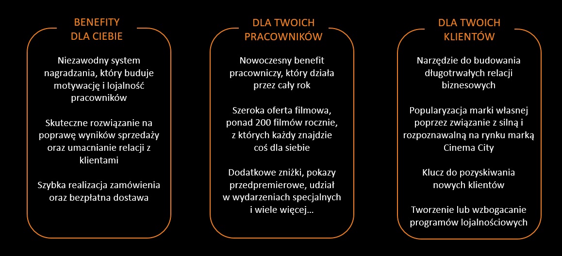 The right package of benefits results in an increase in work efficiency, and thus faster achievement of the intended goals. It is an effective solution for improving sales results or strengthening customer relationships. There are many opportunities to give gifts! Christmas, New Year's, birthday, professional promotion or anniversary of work in the company. Access to unlimited movies on the big screen will please everyone!