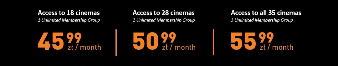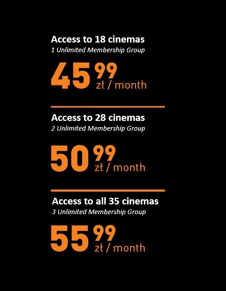 We want our cinema subscription to be the best and most attractive offer on the market. Membership Groups and Unlimited card prices are based on the ticket prices at each cinema. Due to this structure, the cost of membership pays off with just two visits in the cinema.