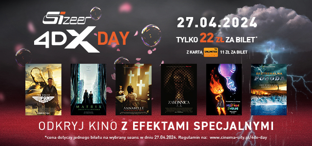 27 kwietnia we wszystkich salach Sizeer 4DX® w sześciu miastach w Polsce już po raz drugi odbędzie się wyjątkowe wydarzenie dla wszystkich kinomanów żądnych wrażeń– 4DX DAY w Cinema City. Tego dnia w Warszawie, Krakowie, Wrocławiu, Bydgoszczy, Lublinie i Łodzi do formatu 4DX powrócą wielkie hity filmowe, które będzie można przeżyć ponownie wszystkimi zmysłami! Mowa tu o takich tytułach jak: „Top Gun: Maverick”, „Zakonnica II”, „Annabelle: Narodziny zła”, „Między nami żywiołami”, „Matrix Zmartwychwstania” oraz po raz pierwszy grany dla szerokiej publiczności, dokumentalny film przyrodniczy „Ekstremalna Pogoda” połączony z interaktywnym quizem. Bilety podczas 4DX Day dostępne będą w wyjątkowej cenie - 22 zł za film.