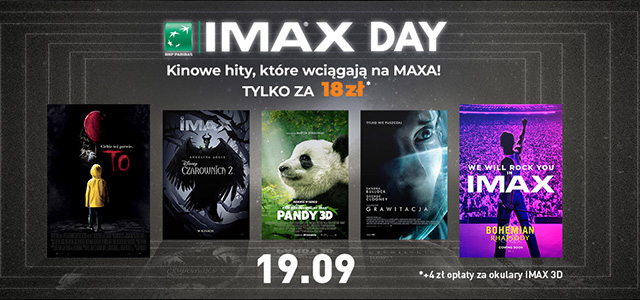 W życiu każdego człowieka przychodzi taki moment, kiedy ma się ochotę sięgnąć drugi raz po ten sam tytuł filmowy. Jeśli więc już chcielibyście to zrobić, warto uczynić to właśnie 19 września w jedynym takim dniu w roku, czyli podczas Imax Day. Tego dnia w 5 kinach Cinema City będziecie mogli obejrzeć pięć wyjątkowych produkcji, które albo już widzieliście, albo dopiero będziecie mieli okazję zobaczyć po raz pierwszy na wielkim ekranie, a do tego w wyjątkowej sali IMAX. Jeżeli zaś jeszcze nigdy nie mieliście okazji wybrać się do IMAX, aż sami Wam zazdrościmy niepowtarzalnych kinowych przeżyć, które na Was czekają!