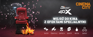 Sala 4DX natomiast to miejsce, w którym filmowa fikcja dosłownie staje się rzeczywistością. Dzięki ruchomym fotelom i zaawansowanym rozwiązaniom środowiskowym (ruch, światło, zapach, woda, wiatr, bańki) oferuje absolutne, pełne efektów specjalnych przeżycie, w których widz staje się częścią filmu. Możesz poczuć wiatr we włosach, czy turbulencje podczas najlepszych scen akcji. Sale 4DX znajdziecie w Cinema City Arkadia (Warszawa), Cinema City Bydgoszcz, Cinema City Manufaktura (Łódź), Cinema City Felicity (Lublin) oraz Cinema City Wroclavia (Wrocław).