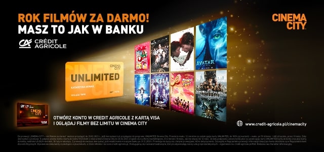 Od teraz w Cinema City możesz oglądać filmy za darmo bez limitu przez cały rok. Właśnie wystartowała akcja „Cinema City - rok filmów za darmo” we współpracy z bankiem Credit Agricole, dzięki której każdy posiadacz karty Unlimited, a także nowy członek programu może otrzymać roczne, bezpłatne członkostwo. Wystarczy otworzyć konto w banku Credit Agricole z kartą VISA Cinema i cieszyć się nielimitowanymi seansami w kinowym fotelu.