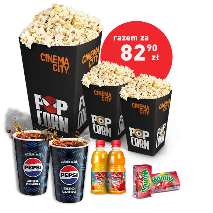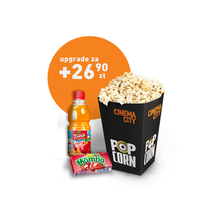 - ZESTAW I w cenie 57,90 zł: popcorn 4,2 l. popcorn 1,5 l, napój 0,5 l, sok TOMA 0,33l, zabawka